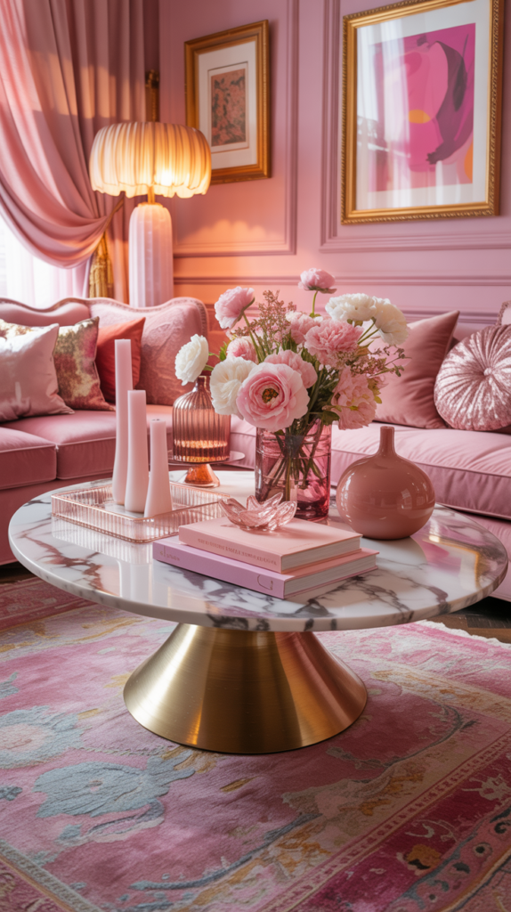 In a room filled with saturated pinks and bold textures, marble and stone act as grounding elements that keep the space feeling refined. Coffee tables, side tables, and decorative trays in white, blush, or veined stone introduce a cool, natural contrast to the warmth of pink. These materials prevent the room from feeling overly soft or decorative by adding weight and visual structure.