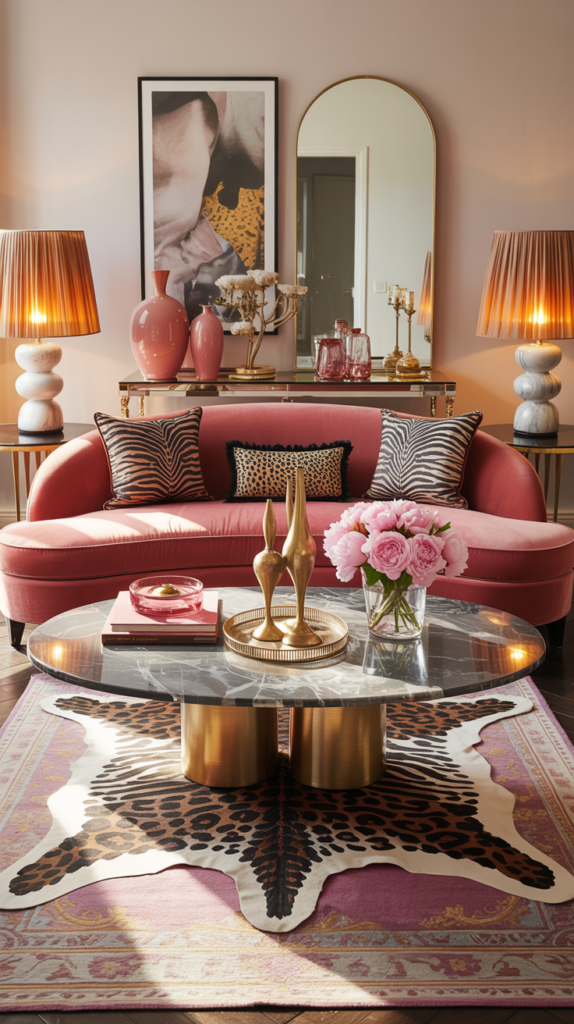 Pairing pink with animal print instantly adds confidence and attitude to a maximalist living room. Leopard, zebra, or abstract animal patterns bring a sense of boldness that cuts through the softness of pink, creating a space that feels powerful rather than pretty. When layered into rugs, pillows, artwork, or accent chairs, animal print introduces movement and visual energy, making the room feel styled like a high-fashion interior rather than a themed space.