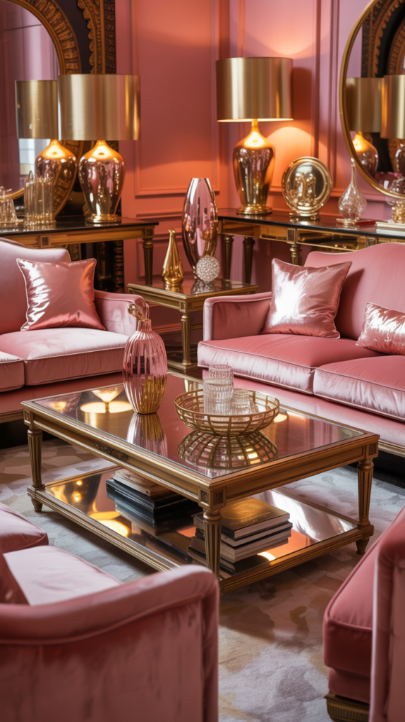 Metallic finishes are what give a pink maximalist living room its signature glamour. Gold, brass, and even touches of chrome or bronze add shine and contrast against soft fabrics and painted walls. Whether it’s in the form of coffee table frames, lighting fixtures, decorative trays, or mirror frames, these reflective details keep the room from feeling too matte or muted.