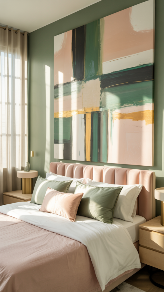Oversized abstract artwork in sage green and blush pink instantly makes a bedroom feel more sophisticated and curated. Instead of lots of small decor pieces, one large statement piece above the bed creates a calm focal point that draws the eye and anchors the whole space. The soft, flowing shapes of abstract art pair beautifully with these gentle colors, giving the room a modern, gallery-like feel while still staying warm and inviting.
