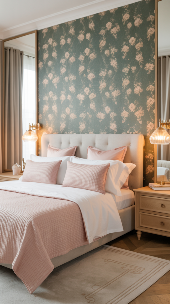 Floral wallpaper in sage and pink tones is such a beautiful way to make your bedroom feel like a dreamy retreat. It adds depth and personality without feeling busy, especially when the colors stay soft and muted. The sage grounds the pattern so it feels calm and natural, while the pink brings in that gentle romantic touch that makes the room feel special and cozy.