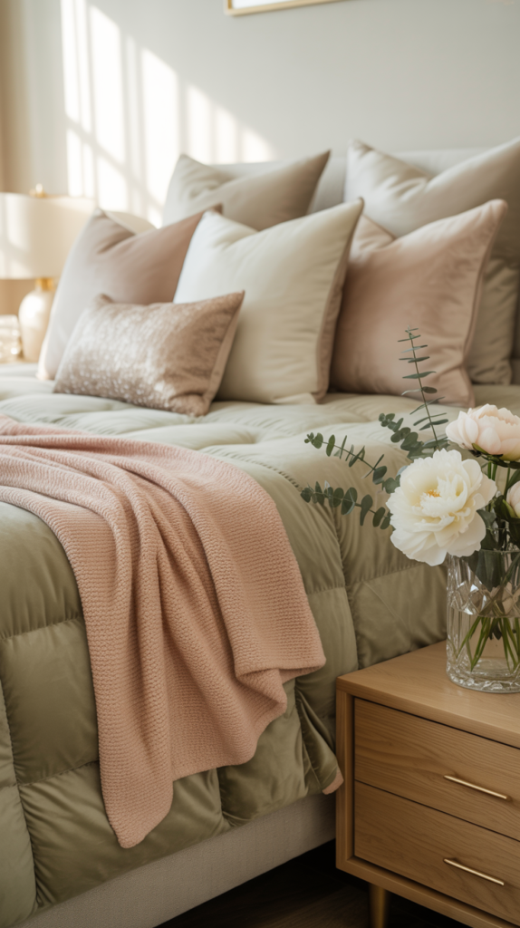 2. Sage Green Bedding with Soft Pink Accent Pillows