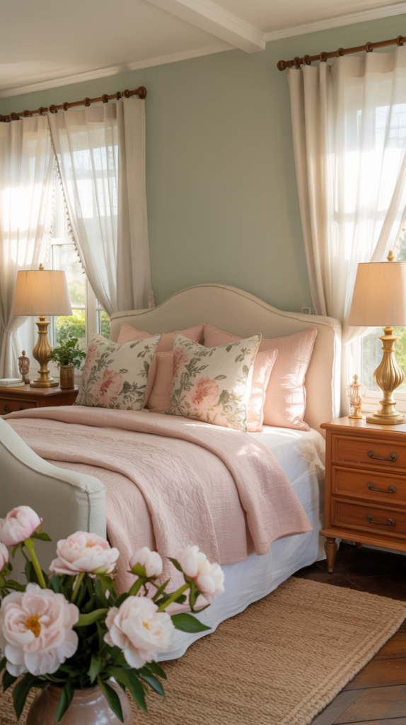 9. Cozy Cottage-Style Sage and Pink Bedroom
