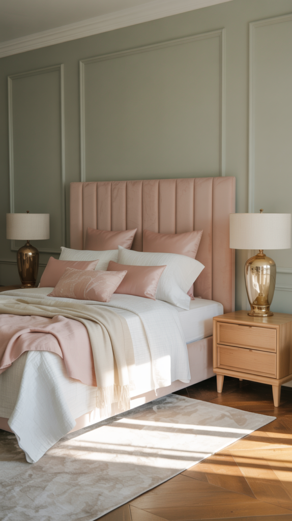 This kind of bedside styling brings the whole color palette together in a subtle way. The sage keeps things calm, the gold adds a touch of glam, and the pink softens everything so it still feels relaxed and inviting. It’s perfect for anyone who wants their bedroom to feel polished but not overly formal.