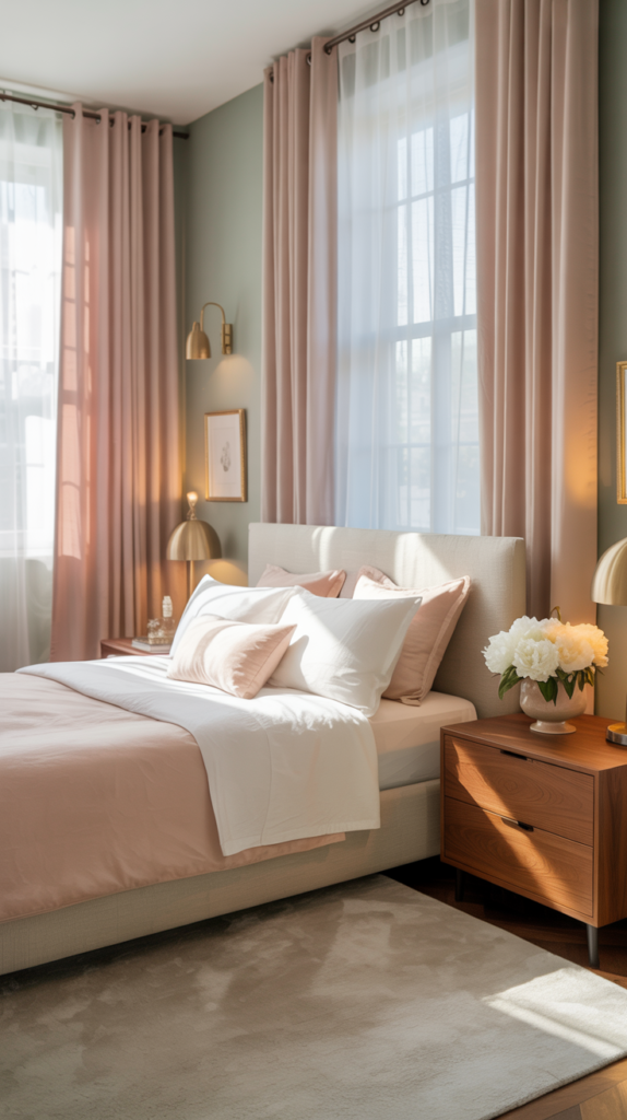 Pink curtains against sage green walls create such a soft, romantic contrast that instantly makes a bedroom feel warmer. The sage gives the room structure and calm, while the pink drapery adds movement and softness, especially when sunlight filters through. It feels gentle and luxurious at the same time, like something you’d see in a beautifully styled boutique hotel.